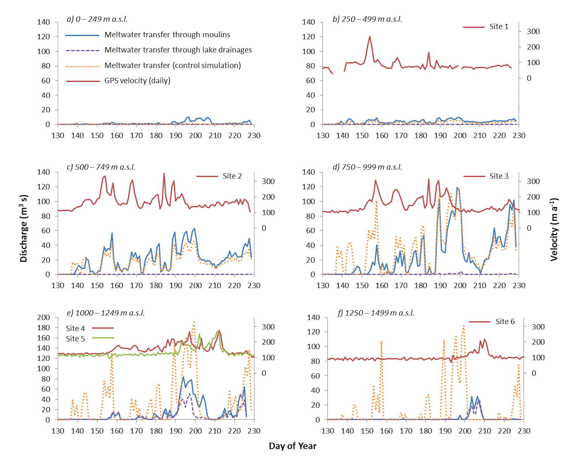 Figure 3. Supraglacial meltwater delivered to the bed each day through modelled lake drainages, moulins, and for the control simulation within ice surface elevation bands of 250 m during 2009. Ice surface velocities from GPS sites 1 – 6 are plotted within their respective elevation bands (after Bartholomew et al., 2011b).