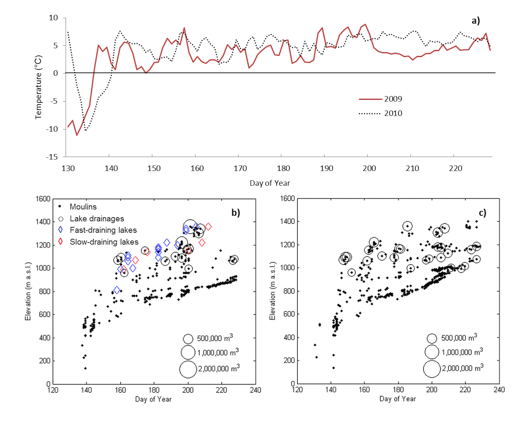 Figure 2. a) Daily average air temperatures at 457 m a.s.l. for 2009 and 2010, and moulin formation and lake drainage through the b) 2009 and c) 2010 melt seasons with elevation. Blue diamonds in panel b) represent observed drainage of lakes in events between two MODIS images, and red diamonds represent lakes which drained over a period of several MODIS images; after figure 2a of Bartholomew et al. (2011a).