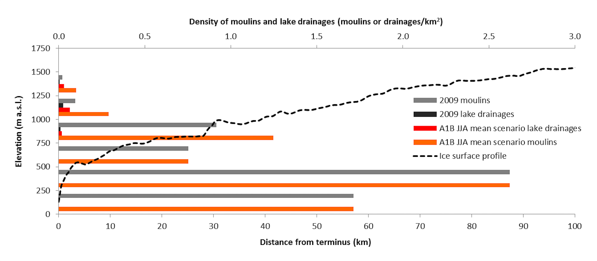 Figure 4. Density of moulins and lake drainages predicted for the IPCC (2007) A1B mean June, July and August Arctic scenario for temperature change within 250 m ice surface elevation bands.