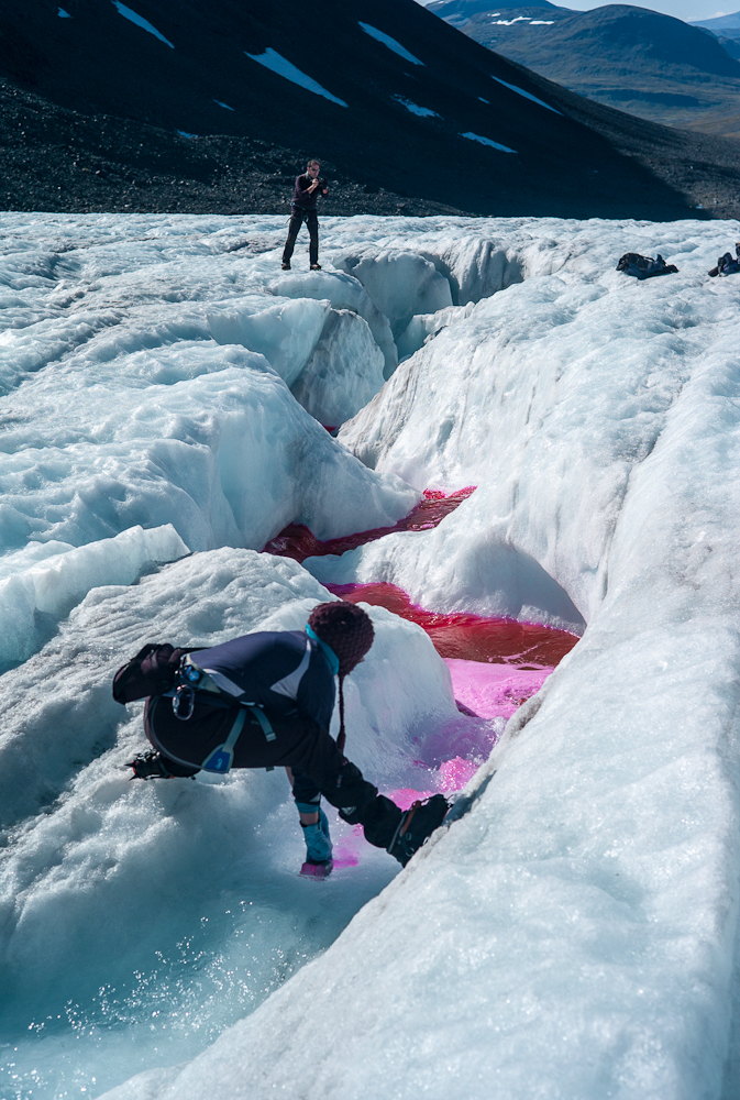 Figure 3. Injection of the water tracing dye rhodamine into a supraglacial stream directly above a moulin on Rabots glaciär.